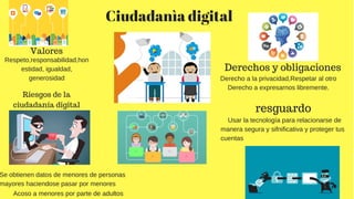 La infografía trata sobre la ciudadanía digital y los valores, derechos, obligaciones y riesgos que conlleva. Algunos valores importantes son el respeto, la responsabilidad y la honestidad. Entre los derechos se encuentran la privacidad y la libre expresión, mientras que las obligaciones incluyen respetar a los demás. Algunos riesgos son el acoso a menores y que adultos obtengan datos personales haciéndose pasar por menores.