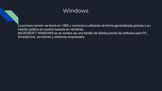 Windows fue lanzado en 1985 y se popularizó por su interfaz gráfica de usuario basada en ventanas. Red Hat Linux es una de las distribuciones de Linux más importantes creada en 1994 y fue pionera en usar RPM como formato de paquetes. iOS, creado por Apple en 2007, es el sistema operativo de los dispositivos móviles de Apple como el iPhone e iPad y es actualmente el segundo sistema operativo móvil más usado.