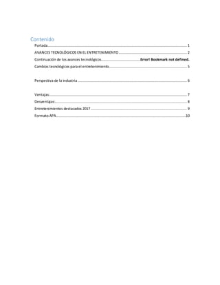 Este documento presenta información sobre los avances tecnológicos en el entretenimiento. Explica cómo la tecnología ha cambiado la forma en que se crean, distribuyen y consumen historias e información de entretenimiento. También analiza las perspectivas de la industria y discute las ventajas y desventajas del entretenimiento tecnológico, incluida la televisión. El documento concluye resumiendo algunos de los principales entretenimientos destacados en 2017.