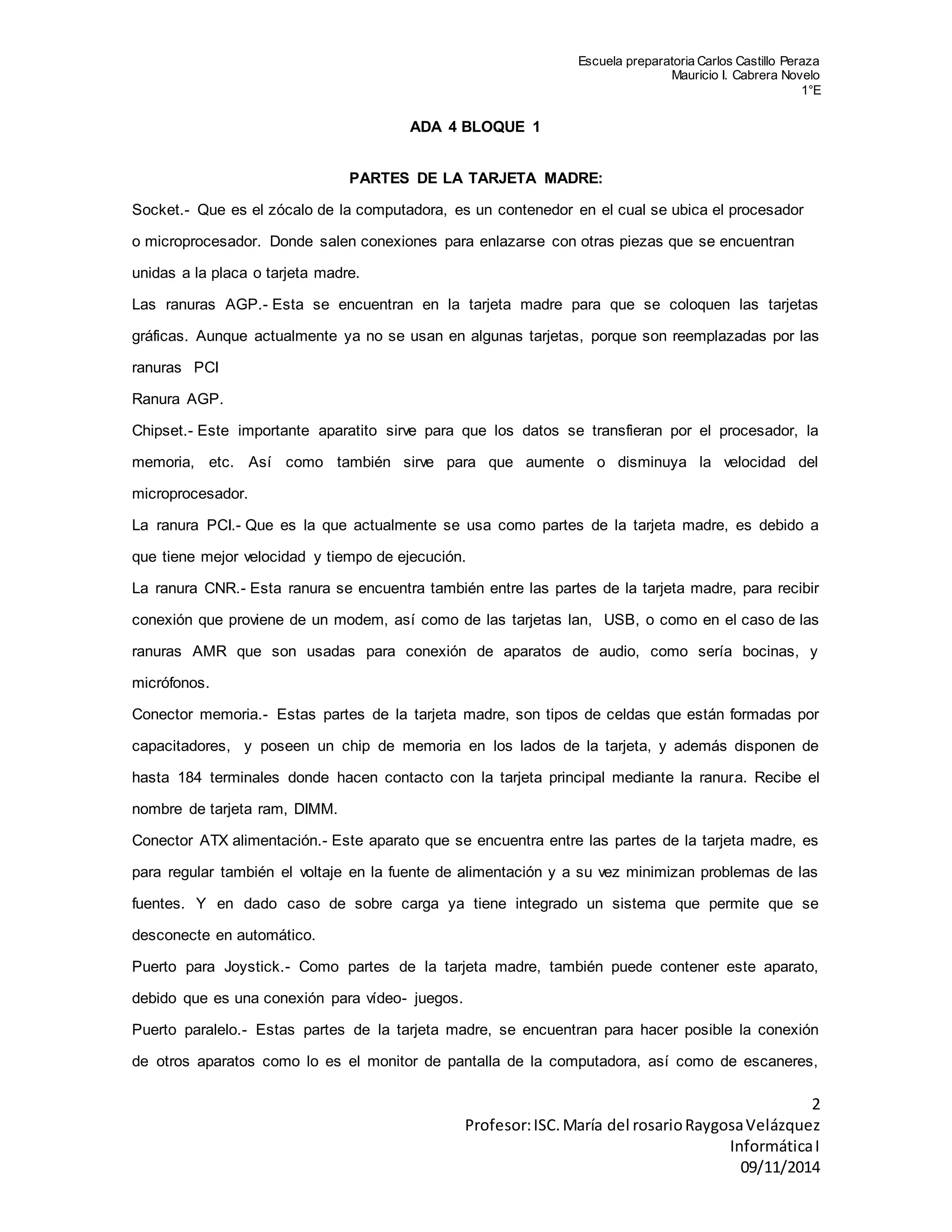 Este documento describe las partes principales de varios componentes de una computadora, incluyendo la tarjeta madre, el disco duro, el teclado y el mouse. Detalla cada una de las partes de la tarjeta madre como el socket del procesador, las ranuras AGP y PCI, el chipset, los conectores de memoria y alimentación. También describe las partes del disco duro como los discos, las cabezas, el eje y el actuador. Finalmente, enumera las partes del teclado como las teclas alfanuméricas, de función, de