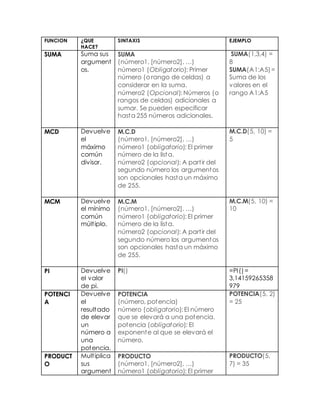 El documento proporciona una lista de funciones comunes de Excel, incluyendo SUMA, PRODUCTO, SI, CONCATENAR, EXTRAE, AHORA y HOY. Para cada función, se describe brevemente su propósito, sintaxis y ejemplos de uso.