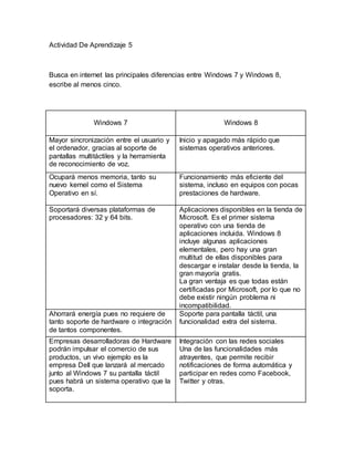 Este documento presenta una actividad de aprendizaje realizada por cuatro alumnos y su maestra. La actividad consistió en que los alumnos investigaran en internet las principales diferencias entre los sistemas operativos Windows 7 y Windows 8, escribiendo al menos cinco diferencias. Los alumnos enumeraron diferencias como una mayor sincronización entre usuario y computadora en Windows 8, aplicaciones disponibles a través de una tienda integrada, y soporte para pantallas táctiles.