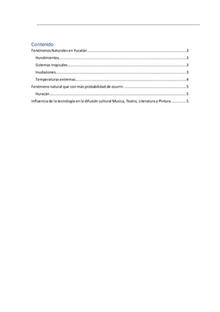 Este documento describe varios fenómenos naturales comunes en Yucatán como hundimientos, sistemas tropicales, inundaciones y temperaturas extremas. También discute cómo la tecnología ha influido en la difusión de la música, el teatro, la literatura y la pintura facilitando su promoción y acceso al público. El fenómeno natural más probable de ocurrir es un huracán debido a la temporada de ciclones.