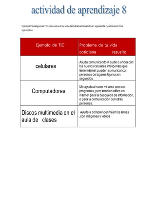 El documento proporciona un ejemplo de cómo las tecnologías de la información y la comunicación (TIC) como los celulares, las computadoras y los discos multimedia se usan en la vida cotidiana de los estudiantes. El equipo Dalmata completa un cuadro enumerando cómo los celulares ayudan a comunicarse, las computadoras se usan para tareas e investigación y los discos multimedia mejoran la comprensión en el aula.