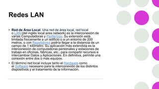 Este documento describe diferentes tipos de redes, incluyendo redes LAN, WAN, PAN, MAN y WLAN. Las redes LAN conectan computadoras y dispositivos dentro de un edificio o área limitada, mientras que las redes WAN se extienden a distancias más grandes entre ciudades y países. Las redes PAN conectan dispositivos personales dentro de 10 metros de una persona, y las redes MAN conectan dispositivos dentro de una ciudad o área metropolitana. Las redes WLAN también conectan dispositivos dentro de