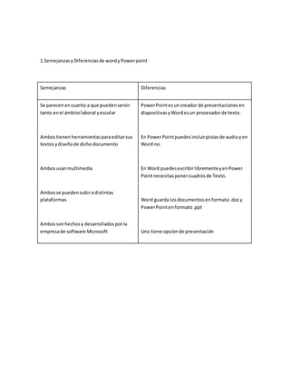Este documento compara y contrasta las similitudes y diferencias entre Microsoft Word y PowerPoint. Ambos programas pueden usarse para editar textos y diseñar documentos, pero Word es principalmente para procesamiento de texto mientras que PowerPoint se enfoca en crear presentaciones en diapositivas. Algunas diferencias clave son que PowerPoint permite incluir audio y necesita cuadros de texto, mientras que Word permite escribir libremente.