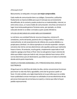 La netiqueta es un conjunto de reglas de etiqueta para comunicaciones en internet que buscan hacerlas más agradables y útiles. Estas reglas guían el uso apropiado del correo electrónico y otros servicios en línea para evitar malentendidos y optimizar el uso de los recursos limitados de la red. Algunas recomendaciones incluyen citar solo las partes relevantes de los mensajes al responder, no enviar spam no solicitado y ser conciso al comunicarse.