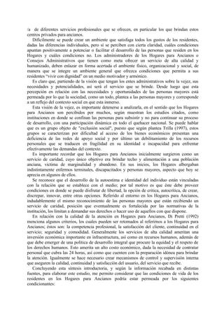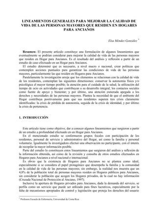 Este documento presenta lineamientos para mejorar la calidad de vida de las personas mayores que residen en hogares para ancianos. Propone que se creen políticas nacionales para garantizar los derechos de las personas mayores y que se fortalezcan los hogares con más recursos, supervisión y personal capacitado. También sugiere mantener la autonomía de los residentes, mejorar sus contactos sociales y ofrecer actividades que promuevan su desarrollo integral.