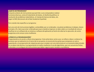 El documento aborda conceptos fundamentales de programación, definiendo qué es un programa, la importancia del lenguaje de programación y el entorno de desarrollo. También explica la metodología de programación, los algoritmos, comandos, scripts, autómatas e instrucciones primitivas, así como la diferencia entre procedimientos y funciones. Además, se discuten los recursos hardware necesarios y el proceso de diseño de programas.