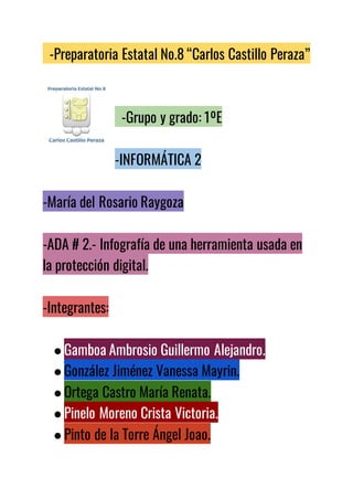 El documento presenta una infografía sobre las cookies realizada por estudiantes de la Preparatoria Estatal No. 8 "Carlos Castillo Peraza". La infografía explica que las cookies son elementos esenciales para ofrecer servicios de publicidad, rendimiento, geolocalización, registro y análisis en las páginas web aunque navegar sin ellas es posible.