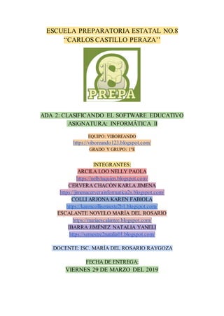 Este documento presenta un resumen de un proyecto de una clase de Informática II sobre la clasificación de software educativo. El equipo "Viboreando" está compuesto por 5 estudiantes de 1° grado E y su profesora es la ISC. María del Rosario Raygoza. El proyecto incluye enlaces a los blogs individuales de cada integrante donde comparten más información sobre la clasificación de software educativo.