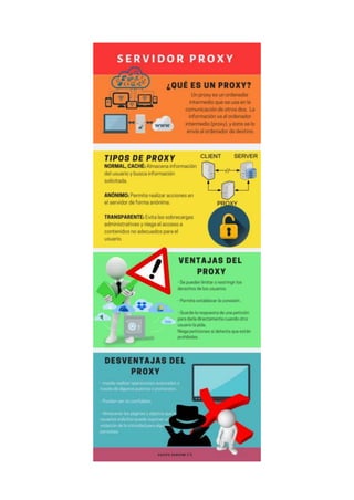 Este documento presenta una infografía sobre los proxys, que son sistemas de computadora que permiten conectar una computadora con otra de forma anónima. Los principales tipos de proxys son normales, incógnitos y transparentes. Los proxys tienen ventajas como conectar, restringir contenidos y proteger datos, pero también pueden ser poco confiables.