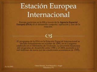 El documento describe la participación de Europa en la Estación Espacial Internacional (ISS) a través de la Agencia Espacial Europea. La ESA se unió formalmente al proyecto de la ISS en 1995 y ha invertido 2.7 mil millones de euros en el desarrollo del programa. Actualmente, la ESA lidera el programa de explotación de la ISS hasta 2020, supervisando las operaciones de los módulos europeos y lanzando vehículos de carga no tripulados para abastecer la estación.