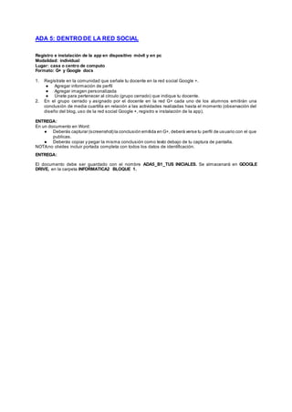 Este documento presenta las instrucciones para la Actividad Digital 5 sobre el uso de redes sociales. Los estudiantes deben registrarse en Google+ y unirse al grupo cerrado asignado por su maestra, publicar una conclusión de media cuartilla sobre las actividades realizadas hasta el momento, y entregar un documento de Word que incluya una captura de pantalla de su publicación en G+ y el texto copiado y pegado debajo. La entrega debe guardarse con el nombre ADA5_Iniciales del estudiante y almacenarse en la carpeta designada