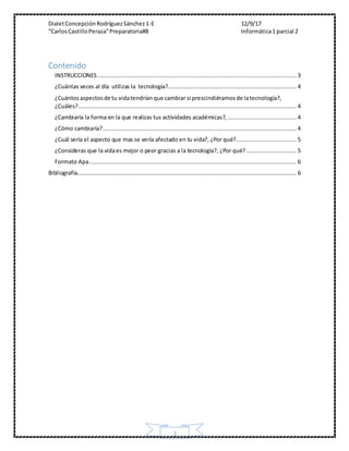 El documento es un trabajo de un estudiante de preparatoria sobre el impacto de la tecnología en la vida cotidiana. Se analizan diversas preguntas, como la frecuencia de uso de tecnología y cómo afectaría la vida sin ella, destacando que la comunicación y la búsqueda de información se verían gravemente afectadas. La estudiante concluye que, a pesar de sus desventajas, la tecnología es una necesidad para el ser humano.
