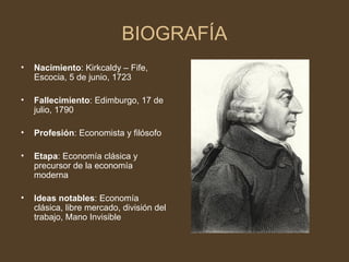 Adam Smith fue un economista y filósofo escocés nacido en 1723 que es considerado el padre de la economía moderna. Escribió dos obras principales: La teoría de los sentimientos morales y La riqueza de las naciones. En La riqueza de las naciones introdujo conceptos como la división del trabajo, el valor de uso frente al valor de cambio, y defendió el libre mercado competitivo como el mecanismo más eficiente de asignación de recursos.