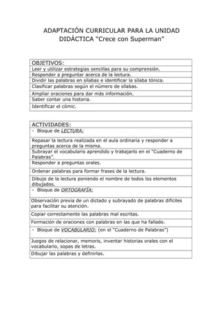 Este documento presenta la adaptación curricular para la unidad didáctica "Crece con Superman" para un estudiante. Los objetivos son leer con comprensión, responder preguntas sobre lecturas, dividir palabras en sílabas e identificar la tónica, clasificar palabras por sílabas y ampliar oraciones. Las actividades incluyen leer, responder preguntas, subrayar vocabulario, ordenar palabras y frases, y dibujar. La metodología utiliza tareas cortas, modelado e imitación, y aprendizaje por descubrimiento.