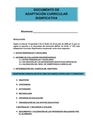Este documento presenta la adaptación curricular significativa de un estudiante en el área de lengua castellana y literatura. Incluye los datos personales y escolares del estudiante, su informe de evaluación psicopedagógica que identifica necesidades educativas especiales relacionadas con dificultades de aprendizaje, y una valoración de su nivel de competencia curricular equivalente al tercer ciclo de primaria con lagunas. Finalmente, detalla los objetivos, contenidos, actividades y criterios de evaluación adaptados para el estudiante.