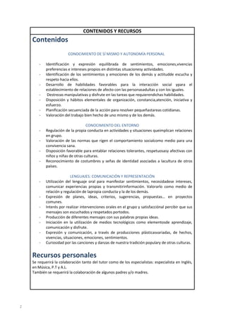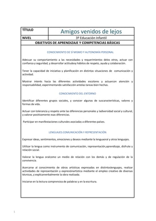 El documento presenta un proyecto educativo para la educación infantil centrado en el conocimiento del entorno y la diversidad cultural, fomentando competencias como el respeto, la colaboración y la expresión oral. Incluye objetivos de aprendizaje y actividades prácticas, como la creación de un mapa del mundo y la elaboración de recuerdos culturales de diferentes países, para promover la participación activa de los alumnos. El enfoque metodológico busca adaptarse a las necesidades individuales de cada niño y se llevarán a cabo evaluaciones continuas para monitorear el progreso.