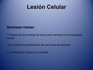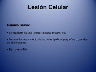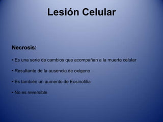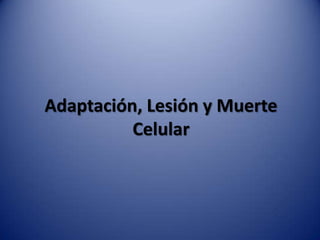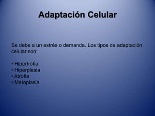 Este documento describe los diferentes tipos de adaptación, lesión y muerte celular. Explica la hipertrofia, hiperplasia, atrofia y metaplasia como formas de adaptación celular. Describe las causas y tipos de lesión celular como la necrosis coagulativa, liquefactiva y caseosa. También explica los mecanismos de lesión como la depleción de ATP, daño mitocondrial y acumulación de especies reactivas de oxígeno. Por último, introduce la apoptosis como una forma programada de muerte celular.