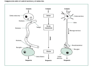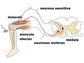 El documento describe el sistema nervioso y endocrino y sus funciones en la respuesta y adaptación del organismo. El sistema nervioso proporciona respuestas rápidas a través de los impulsos neuronales y neurotransmisores, mientras que el sistema endocrino genera respuestas más lentas y duraderas a través de las hormonas en la sangre. El documento también explica el arco reflejo y las partes del sistema nervioso central.
