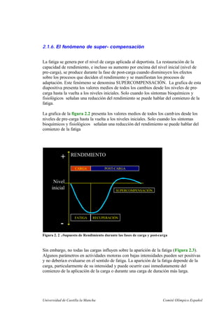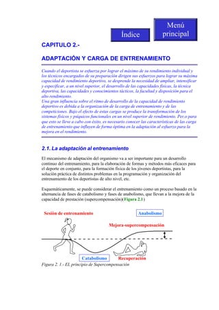 Este documento describe los conceptos de adaptación al entrenamiento, carga de entrenamiento y supercompensación. Explica que la adaptación al entrenamiento depende de la organización adecuada de la carga de entrenamiento y competición, y que bajo el efecto de estas cargas, los sistemas físicos y psíquicos se transforman a un nivel superior de rendimiento. También describe que la supercompensación ocurre cuando la capacidad de rendimiento se recupera y aumenta por encima del nivel inicial después de la fatiga inducida por la carga
