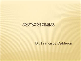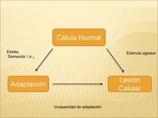 El documento describe los procesos de adaptación celular como la hiperplasia, hipertrofia, atrofia y metaplasia. La hiperplasia implica un aumento en el número de células, la hipertrofia un aumento en el tamaño celular, y la atrofia una disminución. La metaplasia es un cambio reversible en el tipo de célula. También discute la displasia, trastornos del desarrollo y teratología.