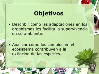 El documento describe las adaptaciones de los organismos y su rol en la supervivencia y en la extinción de especies, categorizándolas en estructurales, fisiológicas y conductuales. También se aborda la biogeografía, los factores que afectan la distribución de especies, y las causas naturales y humanas de la extinción. Además, se enfatiza la importancia de conservar la biodiversidad y se mencionan leyes y estrategias para la protección de especies en peligro.