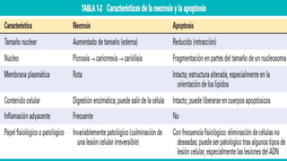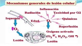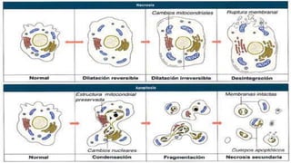 El documento analiza las respuestas celulares al estrés, las adaptaciones y las lesiones que pueden llevar a la muerte celular. Se describe cómo los cambios reversibles y las adaptaciones patológicas permiten a las células sobrevivir ante estímulos dañinos, así como los tipos de muerte celular, incluyendo necrosis y apoptosis. Además, se abordan mecanismos de lesión celular, acumulaciones intracelulares y el envejecimiento celular como consecuencia de daños acumulativos y fallos en la homeostasis.