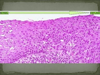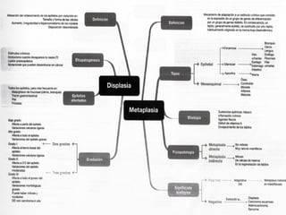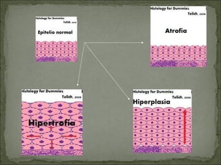 El documento describe diferentes tipos de adaptación celular como respuesta a cambios en el entorno, incluyendo el aumento o disminución del número y tamaño de células a través de hiperplasia e hipertrofia. También describe alteraciones en el patrón de crecimiento celular como metaplasia, displasia y anaplasia, así como anomalías congénitas como agenesia, hipoplasia y aplasia.