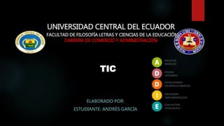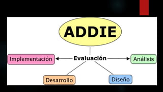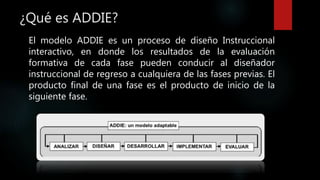 El modelo ADDIE es un proceso de diseño instruccional que consta de 5 fases: Análisis, Diseño, Desarrollo, Implementación y Evaluación. La fase de Análisis implica analizar a los estudiantes, el contenido y el entorno para describir las necesidades formativas. En la fase de Diseño se desarrolla el programa del curso definiendo el enfoque pedagógico y la secuencia del contenido. Luego, en la fase de Desarrollo se crean los materiales de aprendizaje basados en el dise