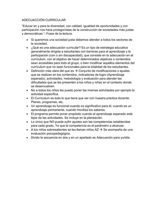 El documento aborda la adecuación curricular como una estrategia educativa para atender a todos los estudiantes, especialmente aquellos con barreras para el aprendizaje. Se define como un conjunto de modificaciones en contenidos, actividades y evaluaciones para hacer el currículum accesible. Además, se enfatiza la importancia de que el aprendizaje sea significativo y funcional para cada estudiante, sin alterar las competencias establecidas.