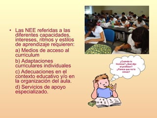 El documento habla sobre las adecuaciones curriculares para estudiantes con necesidades educativas especiales. Explica que las adecuaciones curriculares significativas implican modificaciones sustanciales a uno o más elementos del plan de estudios, mientras que las no significativas no alejan significativamente al estudiante del plan de estudios del grupo. También discute los pasos para formular e implementar adecuaciones curriculares individualizadas, incluyendo identificar las necesidades del estudiante y establecer objetivos, contenidos, metodologías y formas de