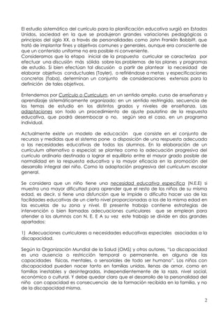Este documento trata sobre las adecuaciones curriculares para alumnos con necesidades educativas especiales. Se divide en dos capítulos que describen las adecuaciones para discapacidades y para necesidades asociadas al ambiente. El capítulo uno cubre discapacidades intelectuales, visuales, auditivas y motrices. El capítulo dos cubre inadaptación social, problemas de aprendizaje, lenguaje, autismo y otros trastornos. El objetivo es brindar estrategias de intervención para atender a todos los alumnos.