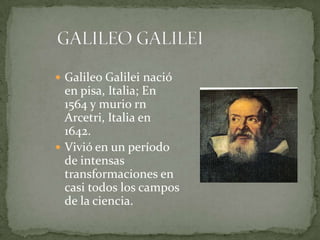 Galileo Galilei nació en 1564 en Pisa, Italia y vivió durante un período de grandes cambios científicos. Realizó importantes descubrimientos en los campos de la física y la astronomía a través de cuidadosos experimentos y razonamiento matemático, incluyendo el descubrimiento de las lunas de Júpiter y las montañas en la Luna usando un telescopio. También determinó matemáticamente que todos los objetos caen a la misma velocidad independientemente de su masa, contrariamente a las