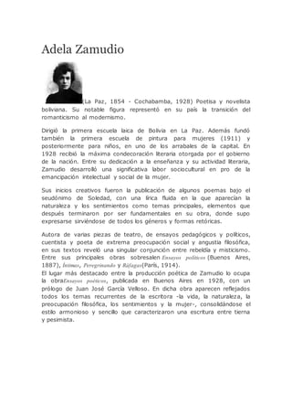 Adela Zamudio fue una poeta y novelista boliviana que representó la transición del romanticismo al modernismo en su país. Dirigió la primera escuela laica de Bolivia y fundó la primera escuela de pintura para mujeres, desarrollando una significativa labor sociocultural en pro de la emancipación de la mujer. Publicó varias obras que exploraron temas sociales y filosóficos de manera rebelde y mística.