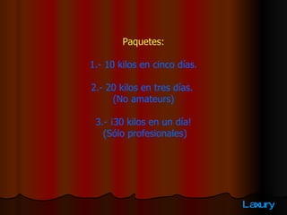 El documento presenta tres paquetes para adelgazar rápidamente: 10 kilos en 5 días, 20 kilos en 3 días y 30 kilos en 1 día. La mujer pide el primer paquete y debe correr detrás de un hombre atlético durante 5 días, perdiendo los 10 kilos. Luego pide el segundo paquete y corre detrás de otro hombre durante 3 días, perdiendo 20 kilos. Finalmente decide pedir el tercer paquete.