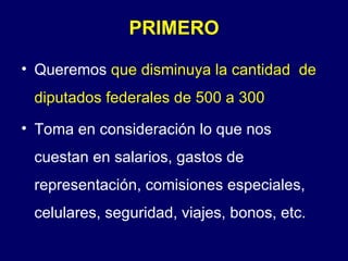 Este documento promueve la participación ciudadana para exigir cambios en el gobierno de México, incluyendo la reducción de legisladores y la eliminación de privilegios como seguros médicos privados. Se demanda la implementación de mecanismos democráticos como plebiscitos y referendos, y se plantea la necesidad de que los gobernantes rindan cuentas sin inmunidad. La iniciativa busca que la ciudadanía tenga voz y voto en la política, denunciando el abuso y el despilfarro por parte de los políticos.