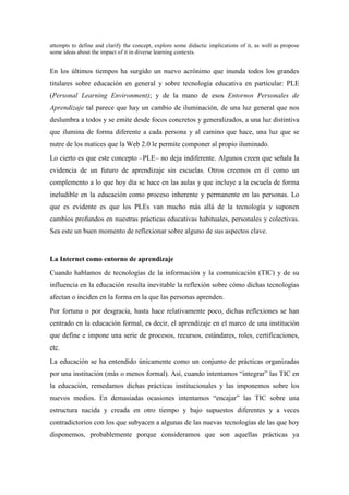 Este documento define y analiza los Entornos Personales de Aprendizaje (PLE). Explica que un PLE no es solo un sistema tecnológico, sino una nueva forma de entender el aprendizaje utilizando las tecnologías de la información. Los PLE reconocen que el aprendizaje ocurre en múltiples contextos más allá de las instituciones formales y que la Internet es ahora un importante entorno de aprendizaje. Los PLE rompen con la distinción entre aprendizaje formal e informal al permitir la mezcla de ambos
