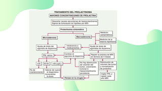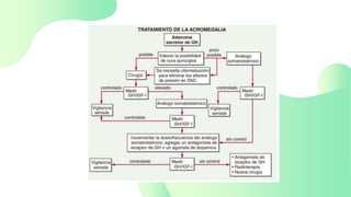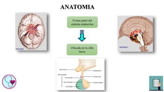 Este documento describe diferentes tipos de adenomas hipofisarios, incluyendo prolactinomas, adenomas productores de GH (acromegalia), adenomas corticotrópicos (síndrome de Cushing), y adenomas no funcionales. Explica la anatomía, fisiopatología, cuadros clínicos, diagnósticos y tratamientos de cada uno. También cubre el panhipopituitarismo, una afección rara causada por lesiones en la hipófisis o hipotálamo que resulta en deficiencia de múltiples hormonas
