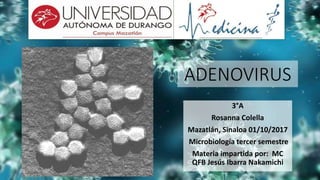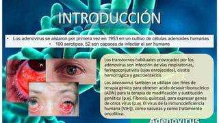 Los adenovirus son virus de ADN bicatenario responsables de diversas infecciones como faringitis, conjuntivitis y gastroenteritis, y son utilizados en terapia génica y tratamientos oncolíticos. Se transmiten a través de gotitas respiratorias y contacto directo, con una amplia resistencia a condiciones adversas. El diagnóstico se realiza mediante análisis clínicos y no se dispone de tratamientos específicos, aunque medidas preventivas como el lavado de manos y la cloración de piscinas pueden ayudar a controlar su propagación.