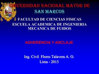 Este documento trata sobre la adherencia y anclaje del acero de refuerzo en el concreto. Explica los tipos de adherencia como la adherencia por contacto, rozamiento y corte. También describe los diferentes tipos de anclaje y los requisitos para el corte y doblado de varillas de refuerzo en estructuras de concreto armado.