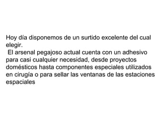 Los adhesivos han existido desde hace mucho tiempo y han evolucionado de pegamentos naturales a una amplia variedad de opciones sintéticas. Los adhesivos modernos incluyen aquellos a base de agua, solventes y reactivos como epóxicos, cianoacrilatos y siliconas, cada uno con ventajas específicas para diferentes aplicaciones. Los tipos comunes se clasifican según su composición, forma de aplicación y fraguado.