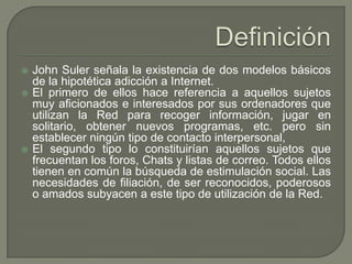 El documento describe dos modelos de adicción a Internet, uno centrado en el uso solitario de la red y otro en la búsqueda de interacción social. Entre los síntomas se incluyen la necesidad de pasar más tiempo en Internet, ansiedad y pensamientos recurrentes sobre la red. Los efectos negativos son la privación de sueño, deterioro de la salud y las relaciones sociales, y un incremento de la depresión y soledad. El texto final incluye un cuestionario para evaluar posibles síntomas de adicción a Internet.