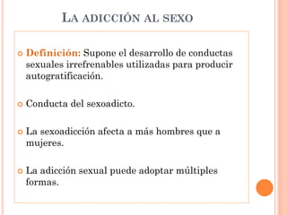Este documento describe la adicción al sexo, incluyendo su definición, síntomas y formas que puede adoptar. Explica que afecta más a hombres que a mujeres y que internet ha aumentado su prevalencia. Detalla los criterios diagnósticos según el DSM-V, consecuencias como la abstinencia, y factores de riesgo como vulnerabilidades en la personalidad. Finalmente, cubre la etiología, comorbilidad y objetivos del tratamiento cognitivo-conductual.
