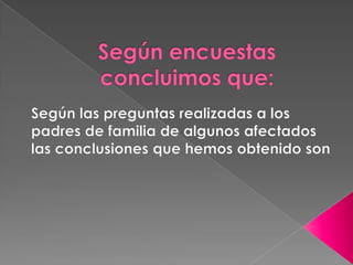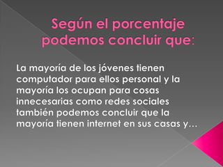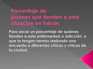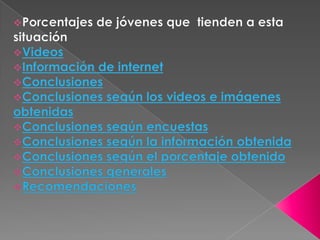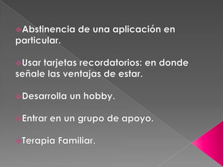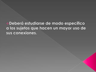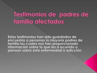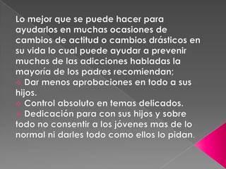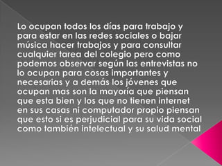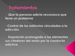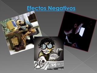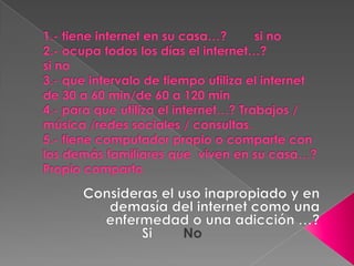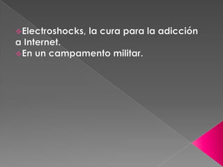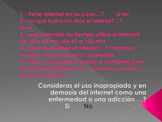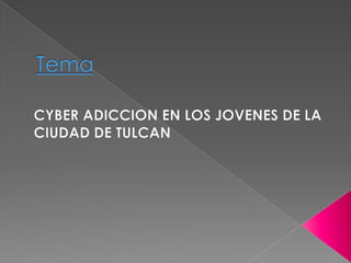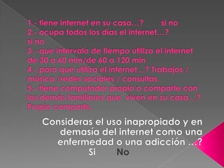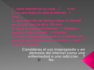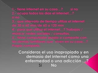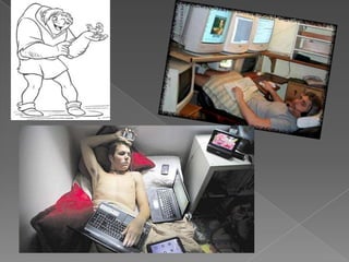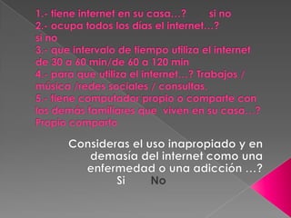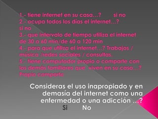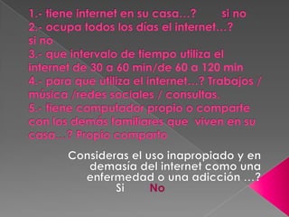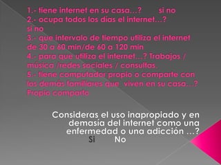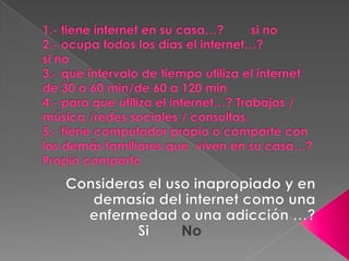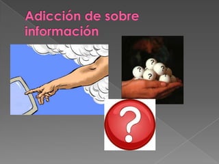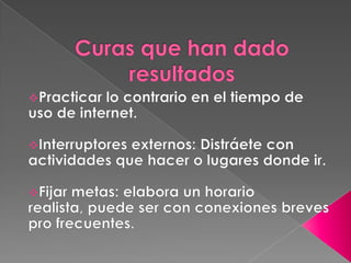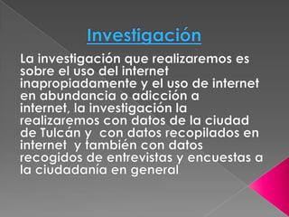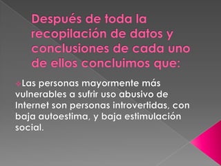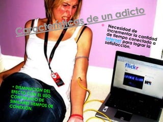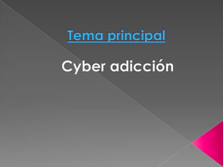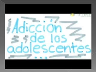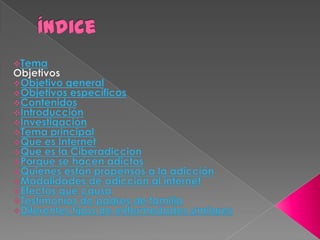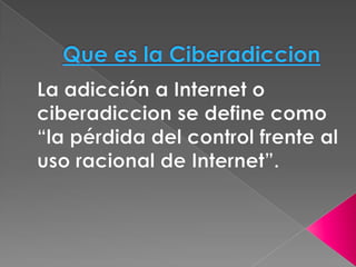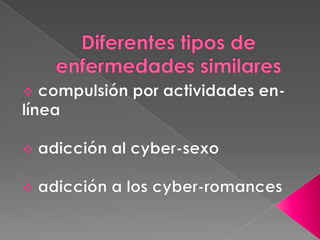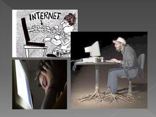 Este documento trata sobre la adicción a Internet. Describe cómo el uso excesivo de Internet puede causar problemas psicológicos como la depresión y el aislamiento social. También explica las señales de alarma de la adicción a Internet y recomienda el control parental del tiempo que los adolescentes pasan en línea.
