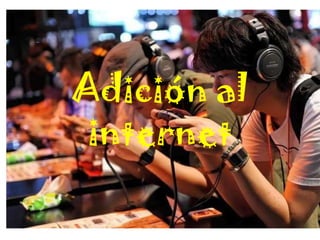 El documento define Internet como una red de redes de ordenadores que comparten datos y recursos a nivel mundial, permitiendo la comunicación entre personas en cualquier lugar. Explica que el abaratamiento de costes y mejoras tecnológicas han llevado a un crecimiento exponencial de usuarios que ahora usan Internet para ocio y negocios. También identifica cuatro modalidades principales de adicción a Internet: adicción cibersexual, adicción a las ciberrelaciones, compulsiones relacionadas con juegos y comercio en línea, y búsqueda ex