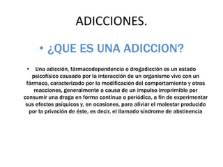 La adicción es un estado psicofísico caracterizado por el impulso irreprimible de consumir sustancias o participar en actividades nocivas, afectando el comportamiento del individuo. Incluye fenómenos de tolerancia y dependencia, donde el uso de sustancias se hace para evitar la abstinencia o sus síntomas. Existen diversos tipos de adicciones, tanto a sustancias como a comportamientos, que pueden causar serios problemas personales y sociales.