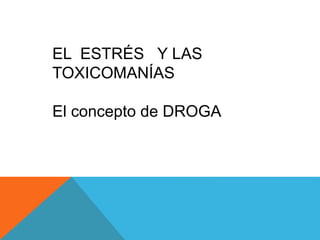 El documento define droga como cualquier sustancia que altera el equilibrio físico o psíquico de una persona. Explica que el estrés y las características del sujeto, la droga y el entorno influyen en el uso y abuso de drogas. Describe las drogas estimulantes, depresoras y alucinógenas, y sus efectos en el sistema nervioso.