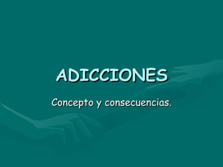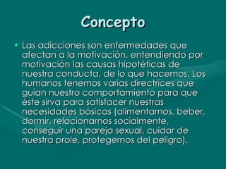 Las adicciones son enfermedades que afectan la motivación humana y conducen a conductas dañinas para satisfacer el deseo de consumir alcohol u otras drogas. Presentan síntomas claros como mentir, robar y defender el uso de drogas, y siguen un proceso de cuatro etapas que termina en la muerte si no se trata. El tratamiento es individualizado y un proceso continuo, ya que cada persona es diferente y las fases del tratamiento se solapan entre sí.